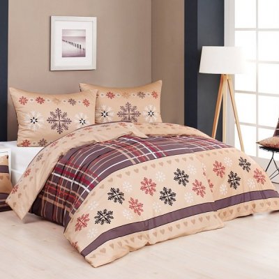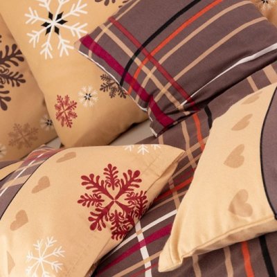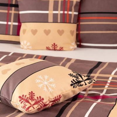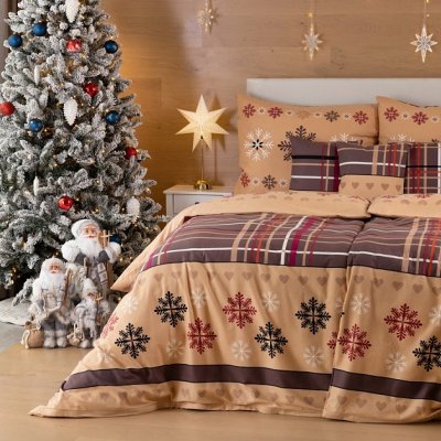 Vianočné posteľné návliečky Tinsel. Atraktívny sviatočný vzor v hrejivých tónoch lieskovoorieškovej a nugátovo hnedej. Spojením dvoch motívov môžete pri ustlaní každý deň obmieňať motív a vychutnávať si sviatočnú atmosféru. Pohodlný spánok zaručí materiál bavlna deluxe vyrobený zo 100% bavlny, ktorý je hladký a príjemný. Návliečka na prikrývku je z oboch strán rovnaká, návliečku na vankúš tvorí na spodnej strane károvaný motív na nugátovo hnedom podklade. Návliečky sú s komfortným zipsovým uzáverom