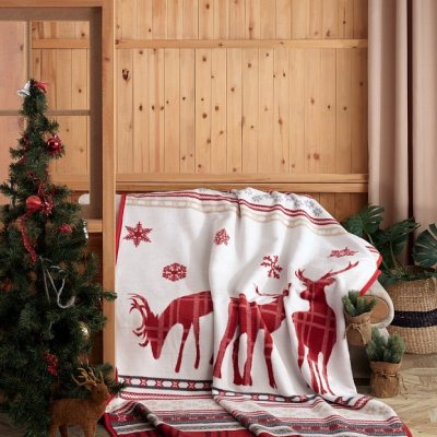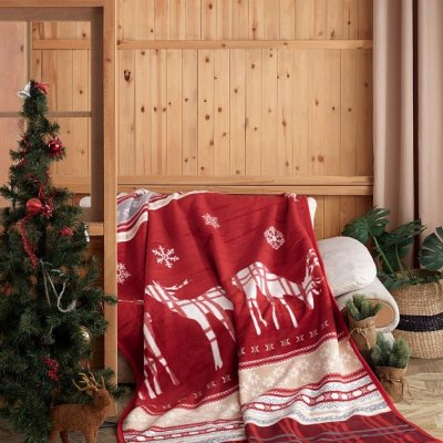 Vianočná deka vo farbe bielej, svetlo šedej, béžovej vínovej a červenej, doplní každý moderný interiér. Spodná strana deky je vyhotovená inverzne. Deka je Ideálna na prikrytie počas zimných večerov k TV ale aj na prekrytie sedačky.