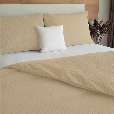 Posteľné návliečky v svetlo hnedom prevedení, ktoré netreba žehliť. Jednoduché neutrálne obliečky v praktickom krepovom prevedení bez žehlenia.