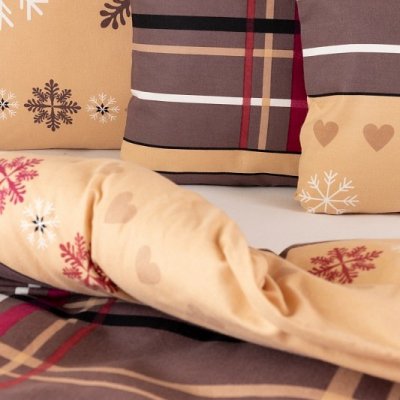 Krepové Vianočné posteľné návliečky bez žehlenia. Atraktívny sviatočný vzor v hrejivých tónoch lieskovoorieškovej a nugátovo hnedej prinášajú posteľné obliečky Tinsel. Spojením dvoch motívov môžete pri ustlaní každý deň obmieňať motív a vychutnávať si sviatočnú atmosféru. Pohodlný spánok zaručí materiál krep deluxe vyrobený zo 100% bavlny, ktorý je mäkký a príjemný. Návliečka na prikrývku je z oboch strán rovnaká, návliečku na vankúš tvorí na spodnej strane károvaný motív na nugátovo hnedom podklade. Návliečky sú s komfortným zipsovým uzáverom.