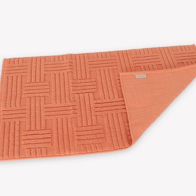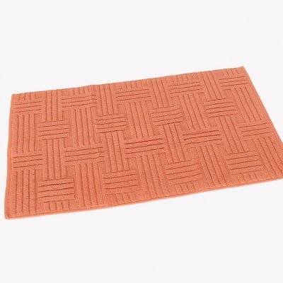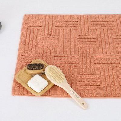Jednoduchý vytkávaný geometrický vzor na kúpeľňovej predložke v kombinácii s dokonalým tehlová odtieňom zútulní Vašu kúpeľňu.