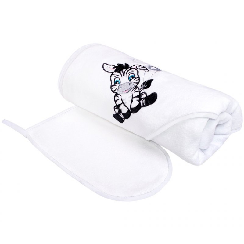 Jemná luxusná detská osuška New Baby. Osuška je s kapucňou, je obojstranná a vyrobená z príjemného a vysoko savého froté materiálu. Z jednej strany je froté materiál, na ktorom je vyšitý obrázok roztomilej zebry, druhá strana je vyrobená z hrejivého plyšu. Po celej dĺžke osušky je biely lem. Jej súčasťou je aj umývacia froté žinka.