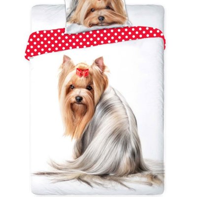 Nádherné posteľné obliečky s motívom Yorkshirskeho teriéra. Z jednej strany je zobrazený yorkshire ako na fotografii, z druhej strany sú obliečky po celom so vzorom bielych bodiek na červenom podklade.