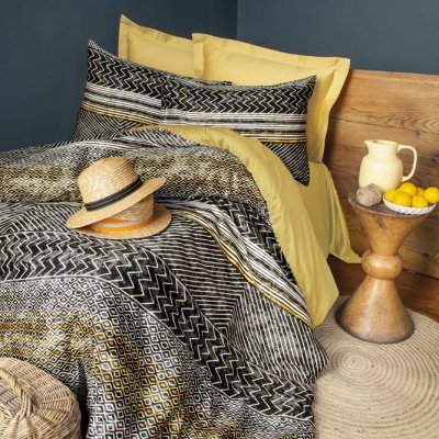 Saténové obliečky Afre vyrobené z kvalitného bavlneného saténu jemného na pohladenie, v zime zahreje, v lete chladí. Prikrývka 140x200cm je z jednej strany vzor ako na fotografii a z opačnej strany bez vzoru žltá farba. Vankúše 70x90cm sú obojstranne vzorové ako na fotografii.